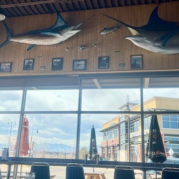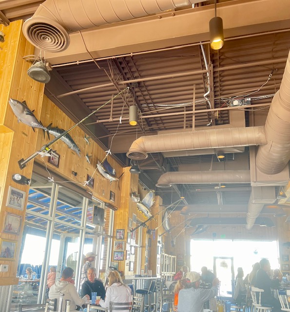 One of those memories was a time I took my two kids to the Texas Gulf Coast and met up with my cousin and her daughter. We bought chicken necks and twine and cut the line to tie to the chicken necks. You then dangle the chicken neck into the water by a dock or pier and the crabs will swim to the meat and their claws grab at it and when they do, you pull up quickly and catch the crab with a net. You place them in a bucket of water until you are ready to go home and cook them. Well, I did not cut the twine long enough. The only one was able to use them was my teenage son. He was about 16 and 6’1″ so his arms were long enough. My daughter got creative and for her and their younger cousin, she untied the string from another chicken necks and tied it to her string to make it longer and her the younger cousin took turns. The little cousin caught a crab and pulled it up quickly and it was a crab tangled in the line of a rod and reel. A really nice rod and reel. The kind that are upwards of $400 USD. She was so excited that she got a crab and a new fishing pole for her grandpa. My son, not to be outdone by a little kid, picked up said kid, hanging her almost upside down over the water so she could catch a grab again, and he would get credit. However, she giggled and laughed so much he was afraid she would fall in and he would get in trouble. It was a fun family memory and the decor of the restaurant reminded us of that sweet time.