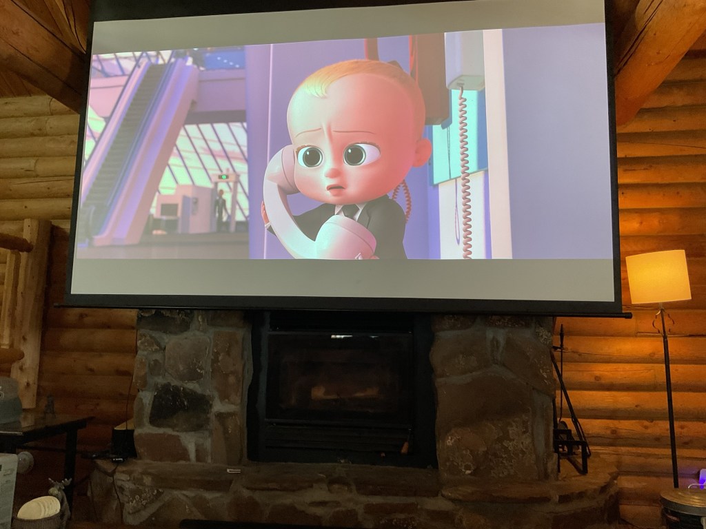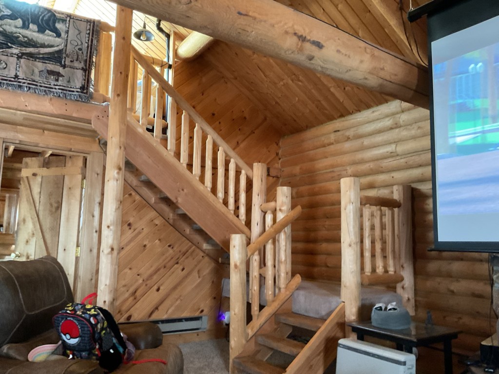 It’s a quaint little cabin, with a loft and a skylight and projector and screen for streaming. Perfect for a grandbaby, a needy doggy and a wacky granny.