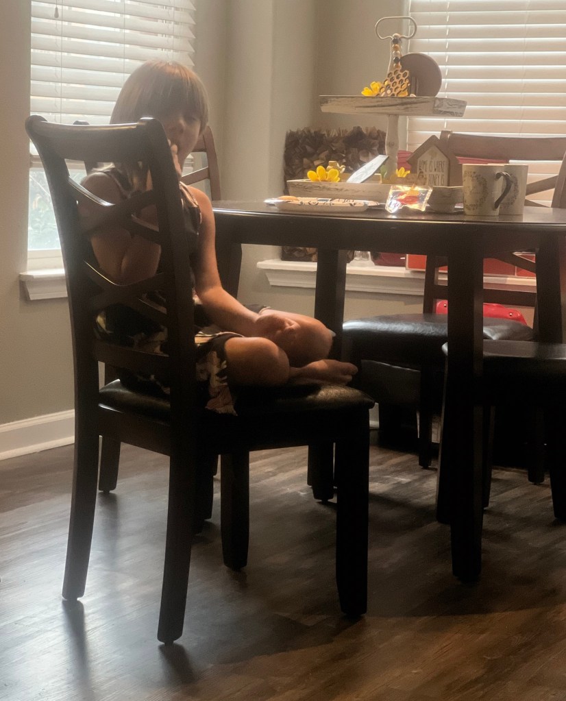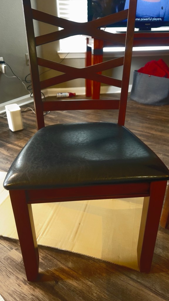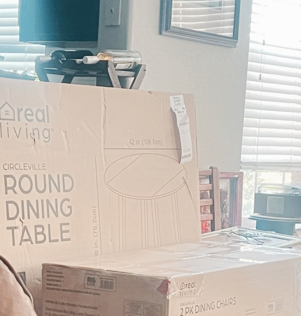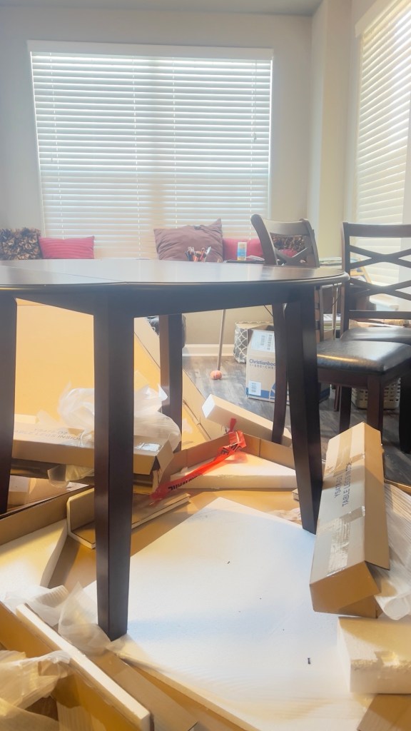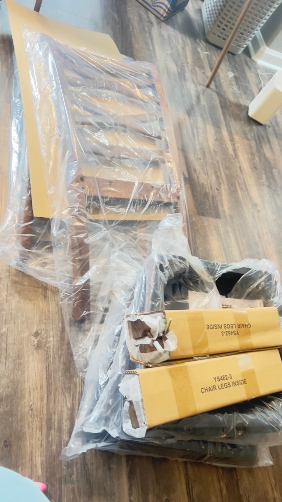 I started with the chairs. They were more complicated thank they looked. My Dad wasn’t here to help me. It is tricky to put a chair together by yourself. I kept feeling like there should an easier way to hold it steady and use an Allen wrench, but there wasn’t and I got the 4 chairs done and only the table remained. I started out putting the chairs together, sitting on my ottoman, then moved to the floor. That was a mistake. Don’t get down on the floor without a plan!