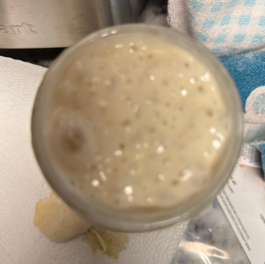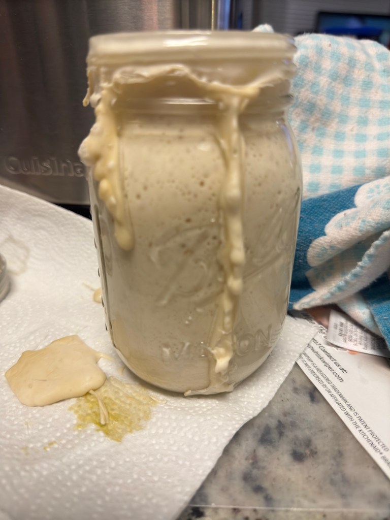 I have been wounded in the battle of bread making. I was leery of it, it made me nervous. I put the jar of starter in my fridge on Monday. On Wednesday, my daughter tells me that if I want to bake, I need to take it out and feed it and let it be warm. It sounded as if I would be caring for an infant. So, I waited a day and took it out on Thursday. My daughter told me that it needed a warm spot so it could grow and be ready to be fed. I put it on the tiny bit of counter space where I thought it would be warm, next to the refrigerator. I didn’t feed it until Saturday morning. I measured it out on a digital scale (as I was advised by my daughter it is a must, no measuring cups). Both bread flour and filtered water. I poured it into the starter slowly, I kept waiting for it to explode. It didn’t. Not at that point. It did eventually. Not like a bottle rocket (do they still make those?) but like, this: