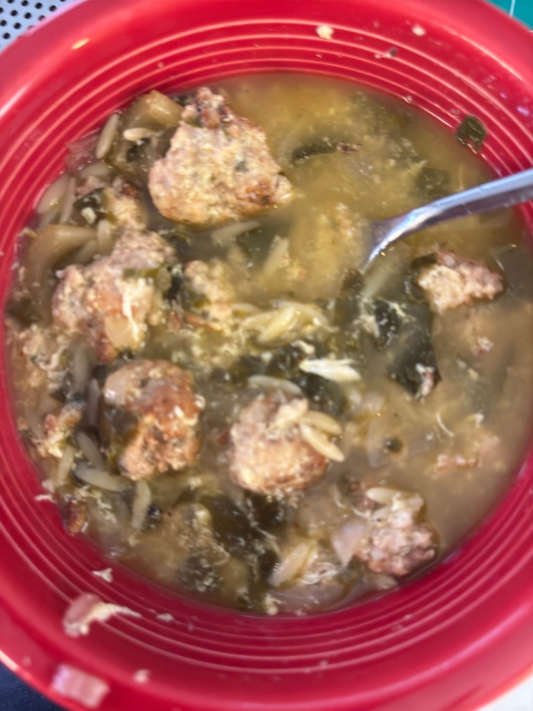 So, as I was exiled to the house, I decided I would make a soup I have always loved, but never had it made fresh. So I followed Ina Garten’s Italian Wedding Soup recipe. I did not have escarole, so I improvised with fresh spinach, and because I had made pizza for my granddaughter and I, I had fried and crumbled Italian pan sausage. I added that to the ground chicken to make the meatballs, something new for me. I sang really loudly while making them to distract myself from the fact that I was touching meat. Even with gloves on, it gives me the heebie-jeebies to touch raw meat. Not sure why, just always been that way. The soup turned out lovely and I will be adding it to my soup rotation. My kids have also asked for some and I have set aside a couple of quarts for them.