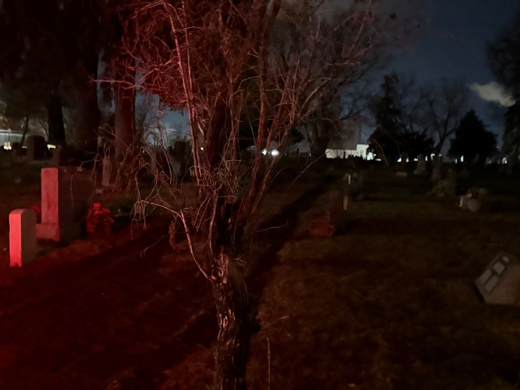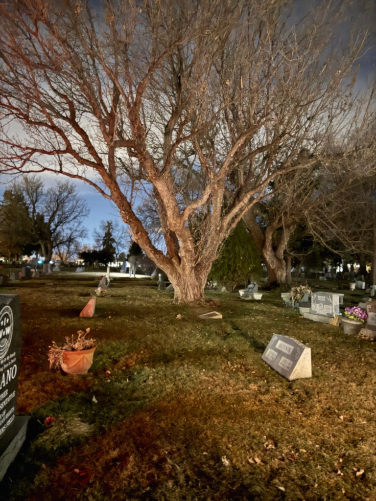 We read on the Atlas Obscura that there was a cemetery there and they were right. Now, let me tell you, first, if you hear stories about two middle age women driving the wrong way on a one way lane, in a cemetery in Lafayette, Colorado and laughing hysterically, or if a lady in a Jeep was semi-illegally parked, with flashers on, waving wildly for you to go around while holding her cell phone as a flashlight to help her friend navigate the cemetery while giggling. That would have been us. It took some expert Nancy Drew skills to find it because there was not a tree growing from the heart thru the grave. There were a copse of trees, three to be exact, and there we found the grave.